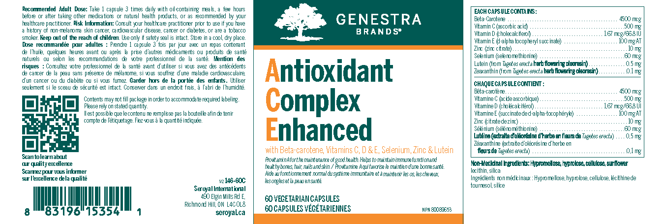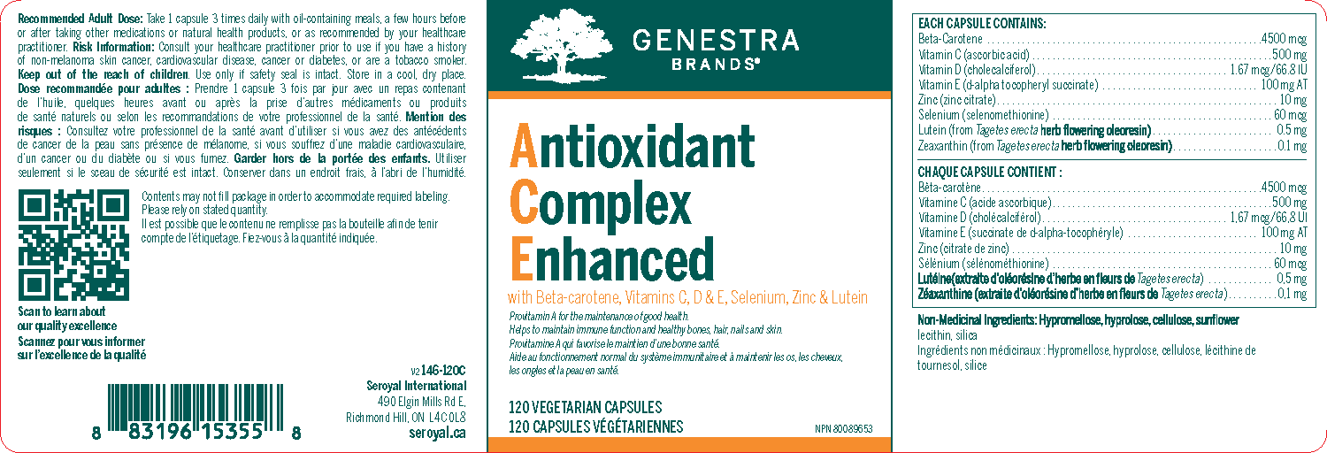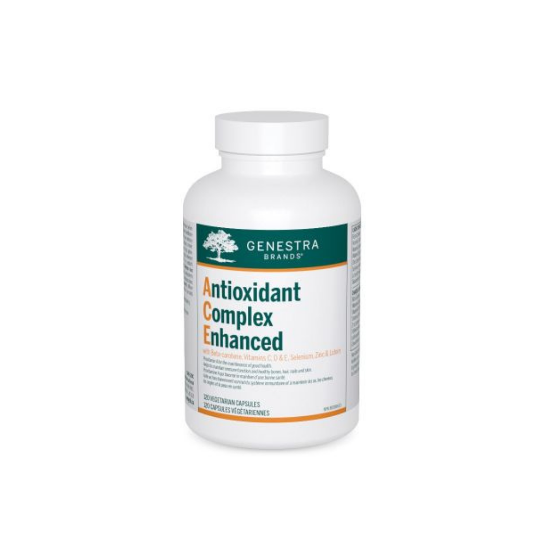 Antioxidant Complex Enhanced supports antioxidant defence with a comprehensive combination of vitamins and minerals, plus lutein and zeaxanthin. Antioxidants play an important role in the body by reducing the production and propagation of free radicals.1 Vitamin C is the most effective water-soluble antioxidant in the plasma and cellular fluid, while vitamin E is known to support antioxidant defence in cell membranes.2 Selenium provides further support as a component of the antioxidant enzyme glutathione peroxidase, and plays an important role in supporting thyroid health by reducing oxidative damage generated during the production of thyroid hormones.1,3 Antioxidant Complex Enhanced also offers lutein and zeaxanthin, the primary carotenoids in the macula and retina.4 Lutein provides unique antioxidant support to maintain eye health by protecting against oxidative damage from metabolic activity and light exposure.4 Beta-carotene is included as a source of provitamin A to help maintain eyesight, skin, membranes and immune function, while zinc further contributes to immune and skin health by stimulating the production of immune cells and supporting the repair and maintenance of skin structure.5 As the body’s natural defence mechanisms against oxidative stress can become overwhelmed, individuals may benefit from increasing external antioxidant intakes.6